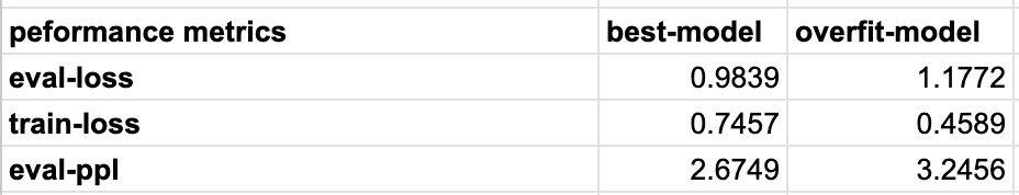 A good rule of thumb is to keep eval loss close to training loss, which you can observe in the best model. This means the model generalizes well, otherwise it means the model is overfitting, i.e memorizing training data, such a model won’t fare well with new questions outside training data spec.