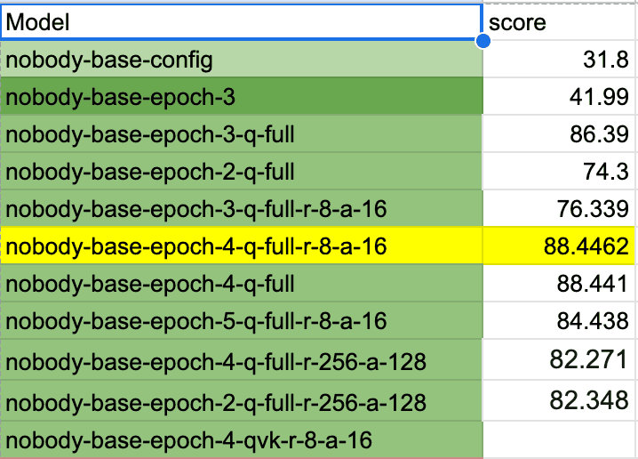 - Enabling LoRA modules for all layers (instead of just query and key) gave me the biggest jump: 86% at epoch 3 and 88% at epoch 4 with lora_r=8 and lora_alpha=16